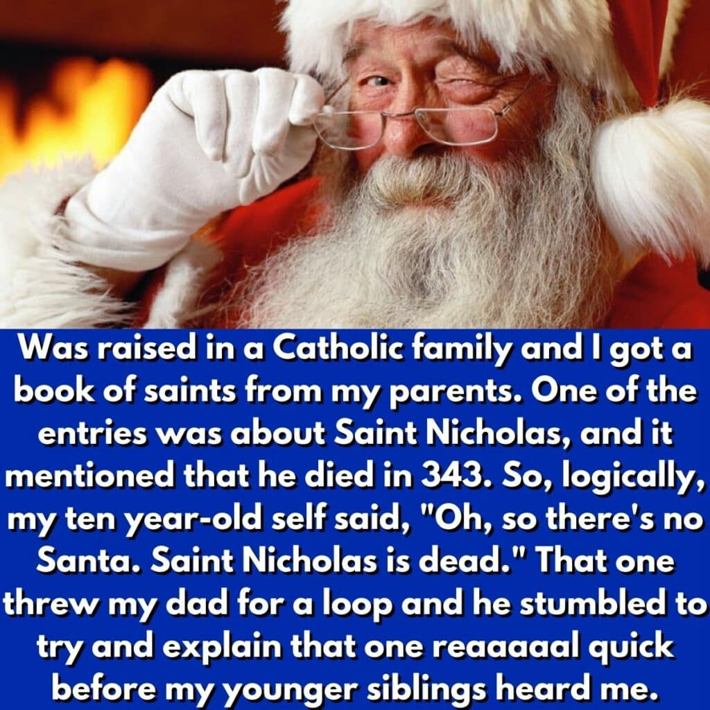 Here’s another sharp kid who put two and two together and realized that Santa was not real. His parents got him a book about saints as a gift, and he read all about Saint Nicholas, who, as we all know, died in 343 AD. This kid must’ve known the origin story of Santa, and he knew that he also goes by the name Saint Nicholas.